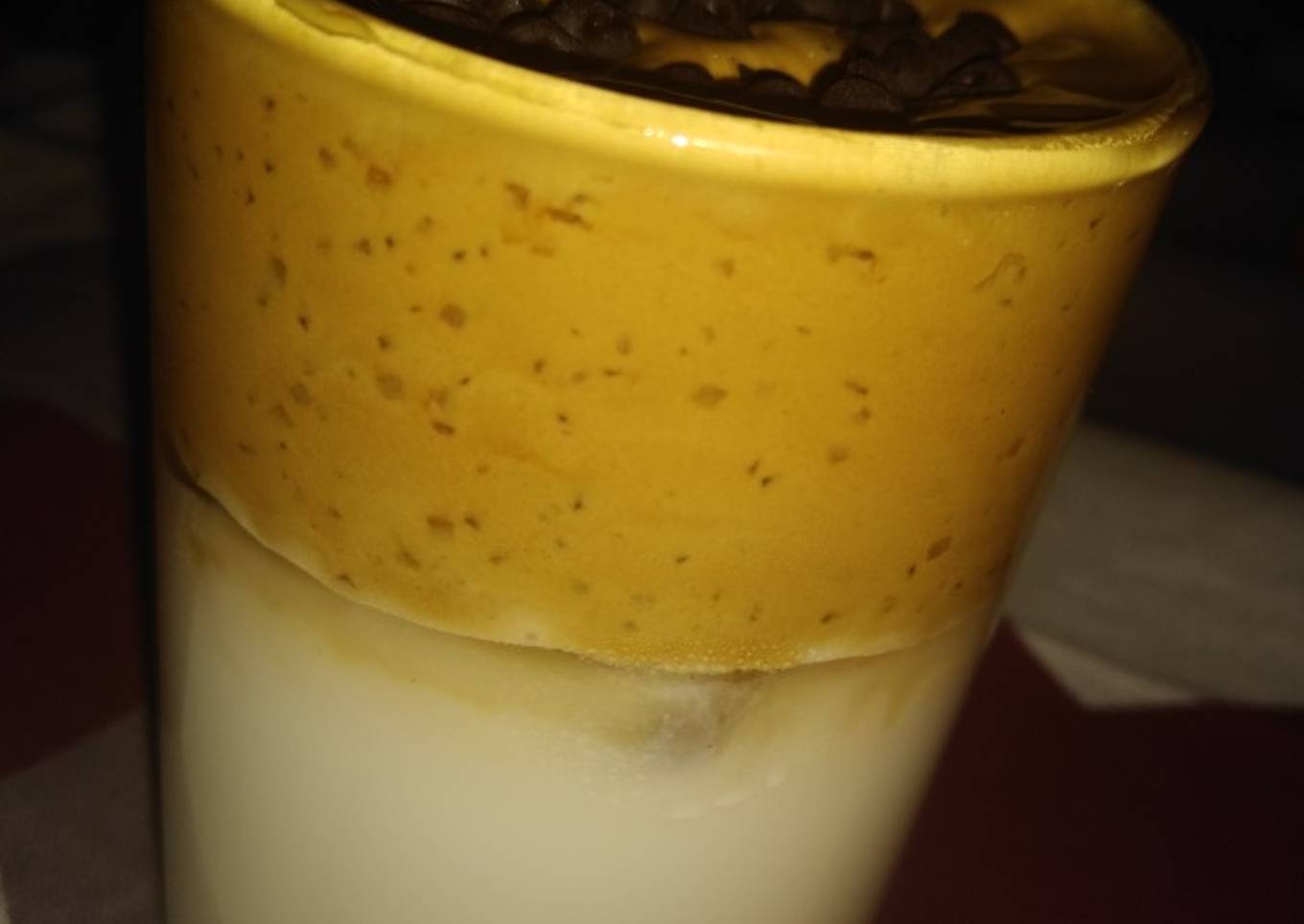 - Now take 2 glass put some ice cubes in it and then pour room temperature milk after that put the coffee mixture foam in it. Put a good quantity of mixture on the top of the milk. And then garnish it with choco cips or sprinkle coffee powder or garnish it with crush chocolate.(acc. To ur choice)