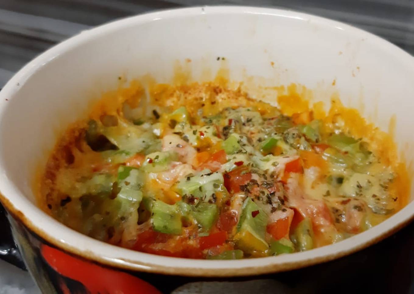 - Spread the dough in mug and spread pizza sauce, veggies and cheese.