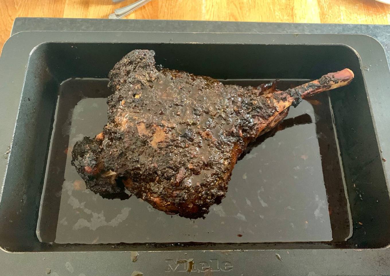 - Preheat the oven to 170c/150c fab and roast fat side down for about 4.5 hours. After 30 minutes of roasting add a cup of boiling water to the pan and use this liquid to baste the meat every hour or so. If needed add more water. To prevent the spices from burning cover with foil for the last three hours.