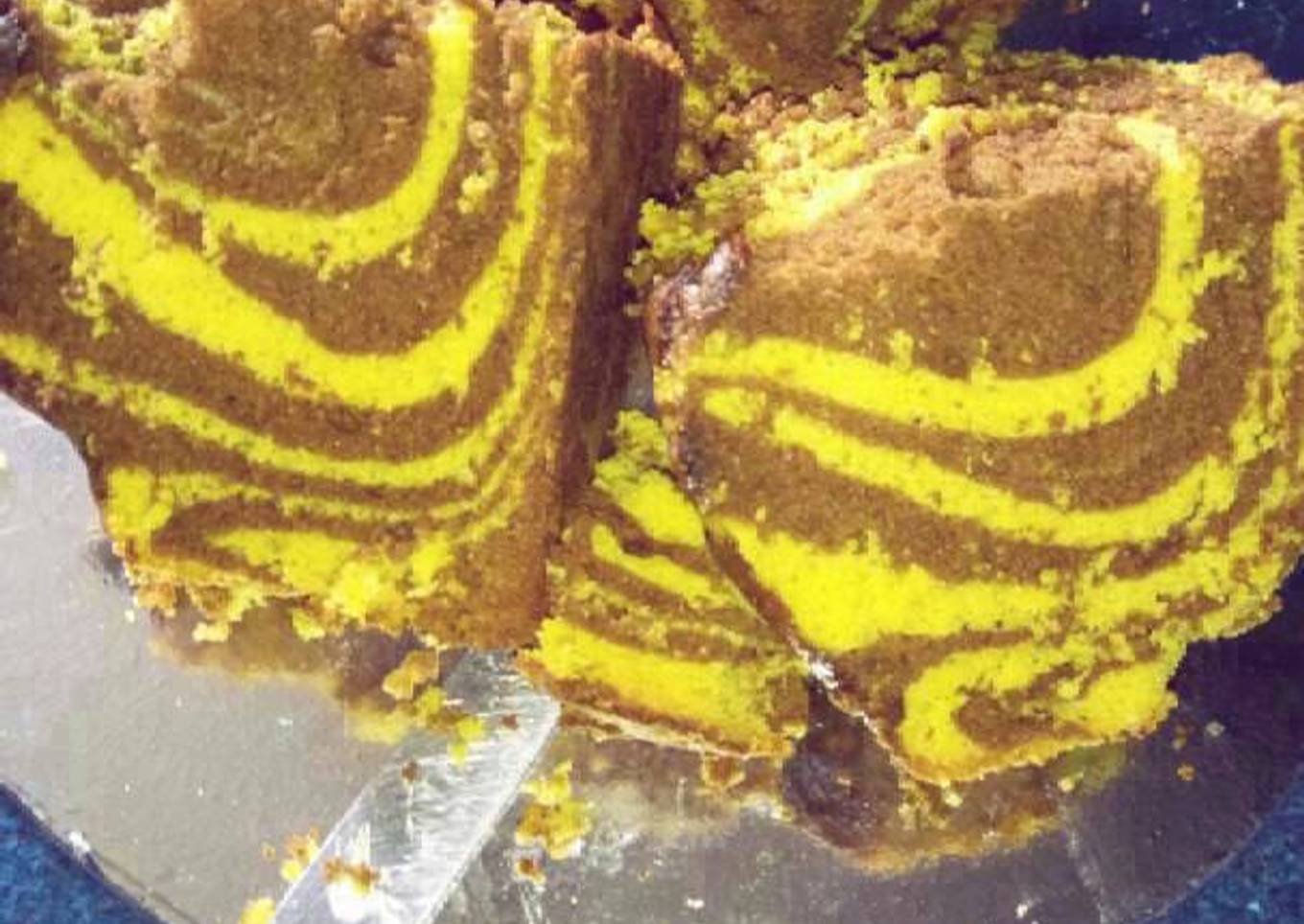 - Now, you get your 2 baking pans of different colours. You add up spoonfuls by spoonfuls of the 2 mixtures alternatively in an overlapping manner(This is to get the zebra stripes)