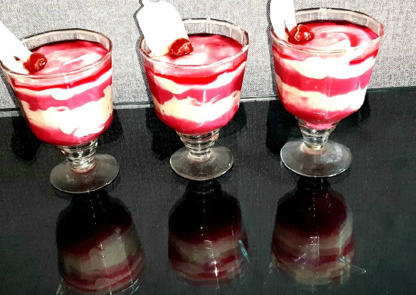 - In the last layer add only 1-1 tsp of ruhafza.Garnish with white chocolate and cherry.Kerp in the fridge for 5 minute to chill then serve.No need to keep for hours.
