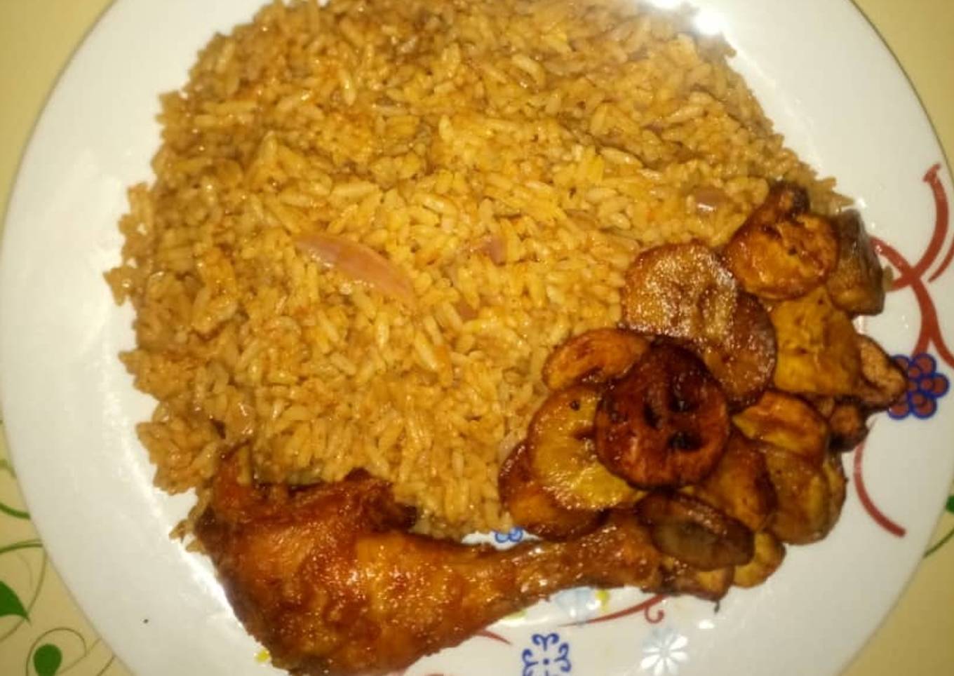 Instructions to make to make Jollof rice & ring plantain with peppered Chicken